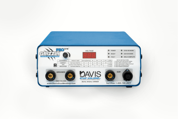 The Grizzly Stud Welder with precision voltage control is a top-quality product meeting the highest requirements in operating convenience, low weight, high efficiency, compact design and absolute safety. This unit features a rugged housing design, increased duty cycle, heavy weld cable set, and robust connectors. The Grizzly is designed with on-board automatic trigger, work surface contact, and reload circuitry for automatic welding.